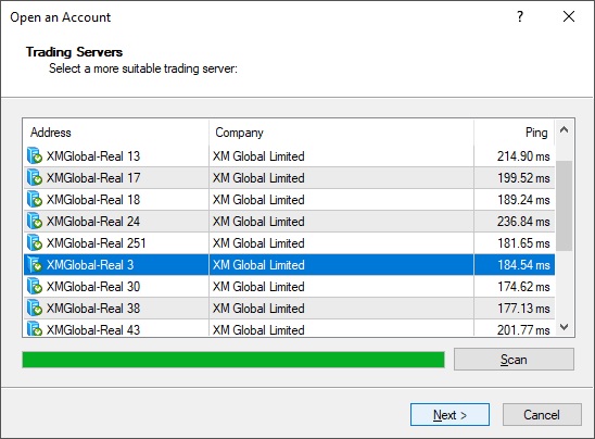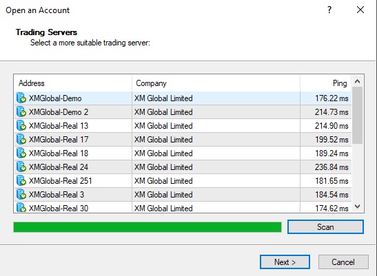 - Klik tombol SCAN dan akan menampilkan daftar Server XMGlobal