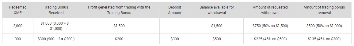 The bonus adds funds to your trading account but it is intended for trading purposes only. Below you can see the specific formulas used to calculate the equivalent value of your XMP to credit bonus.